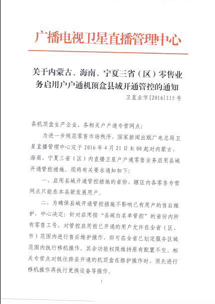 为进一步规范零售市场秩序,国家新闻出版广电总局直播管理中心定于2016年4月21日8:00起,对内蒙古、海南、宁夏三省(区)内直播卫星户户通零售业务启用县域开通管控措施,现将有关要求通知如下: