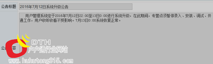 用户管理系统定于2016年7月12日22:00至13日0:00进行系统升级,在此期间,专营点须暂停录入、安装、调试、开通工作,用户收听、收看不受影响。7月13日0:00系统恢复正常。