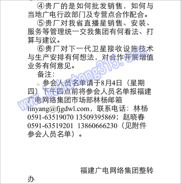 为传达总局广播电视卫星直播管理中心关于开展直播卫星增值业务座谈会的精神,征求相关问题意见,定于8月5日(周五)召开本会议,通知内容如下: |