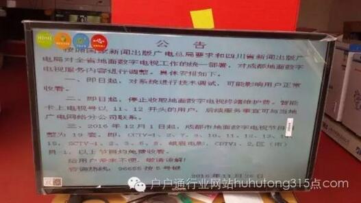 按照国家新闻出版广电总局要求和四川省新闻出版广电局对全省地面数字电视工作的统一部署,决定对全省地面波电视内容进行调整,主要内容是取消加密收费,节目调整为20套左右。 以下截图,分别是四川眉山市、成都市经销商反馈的电视画面公告: |
